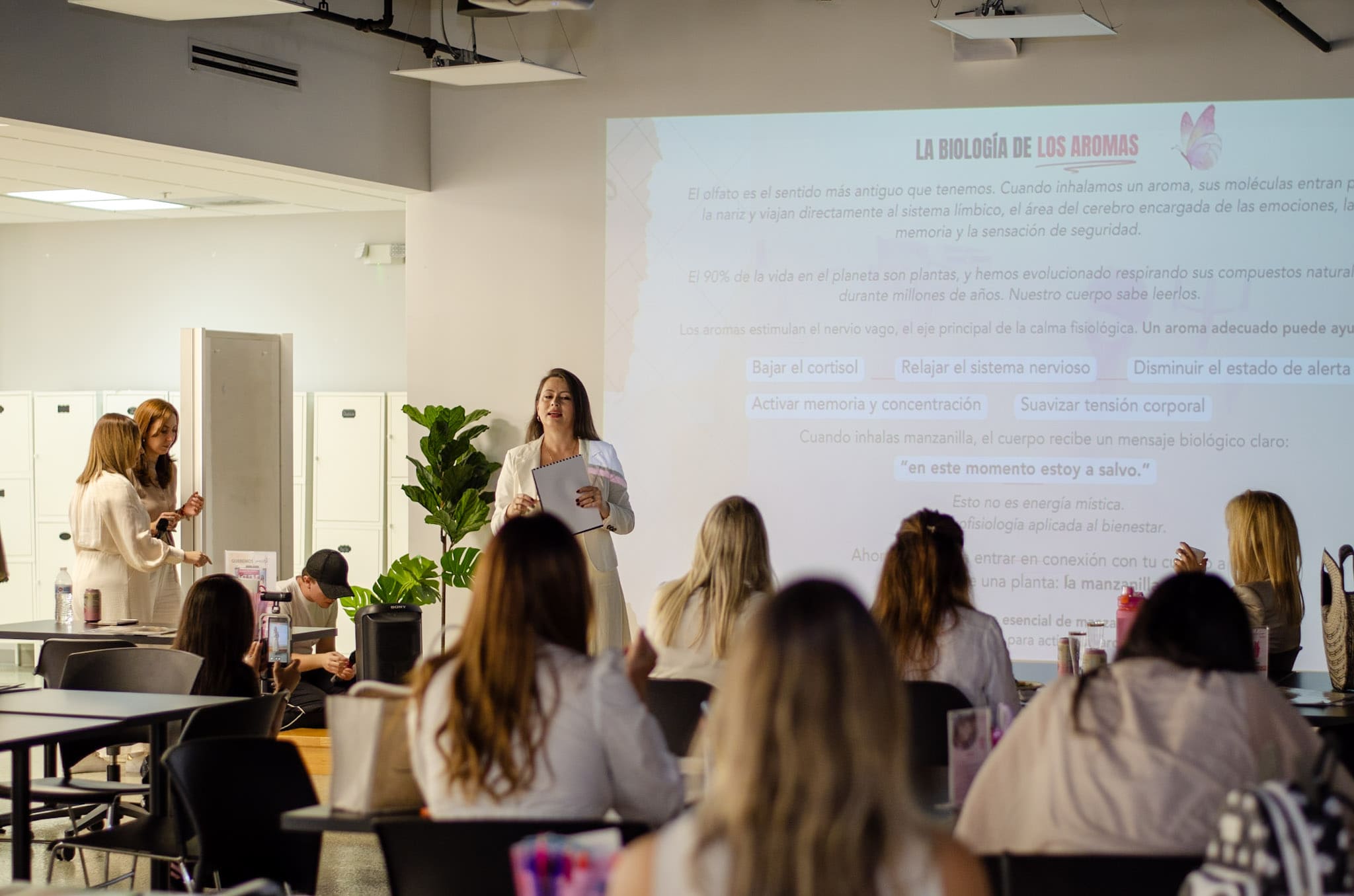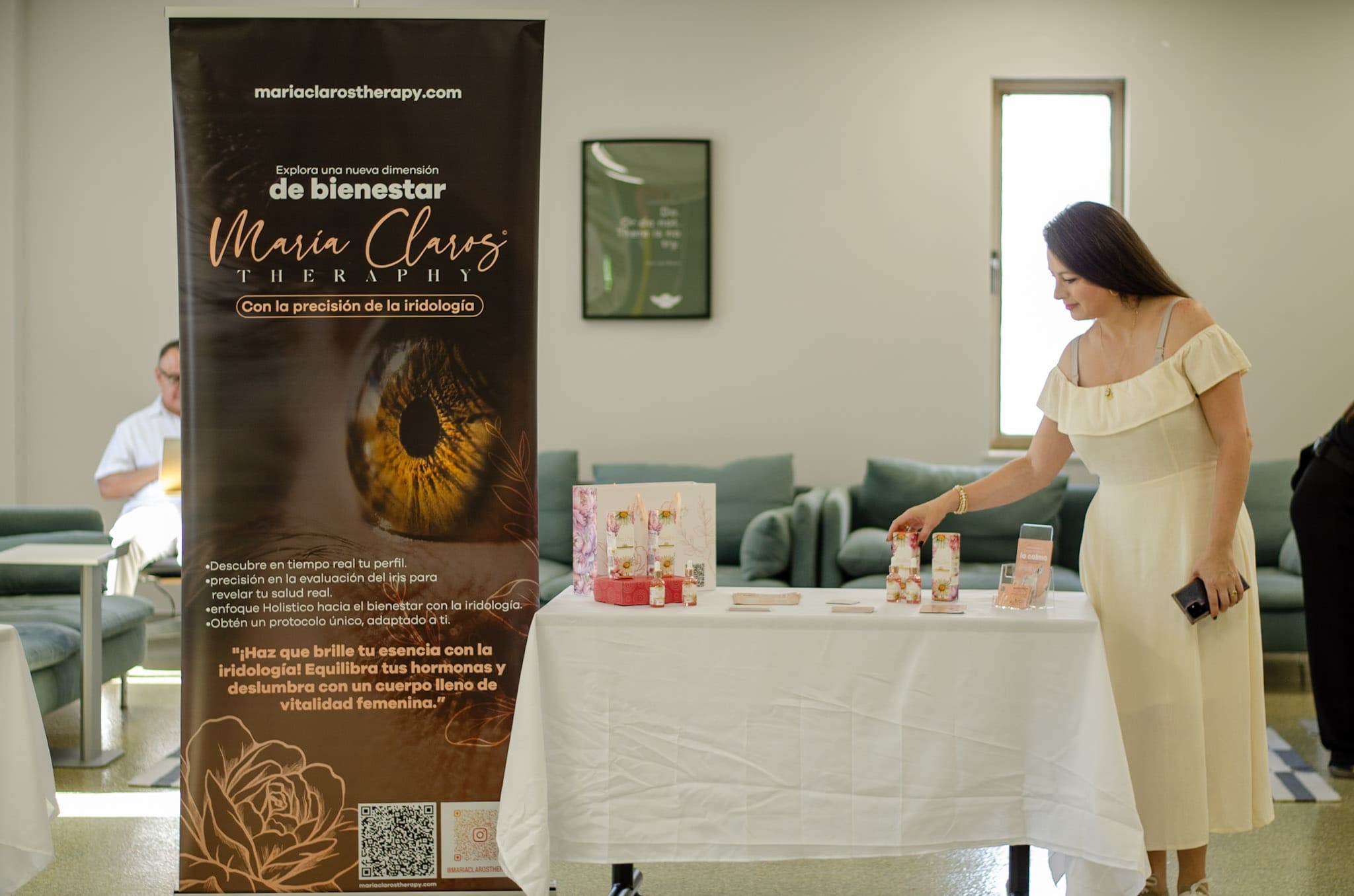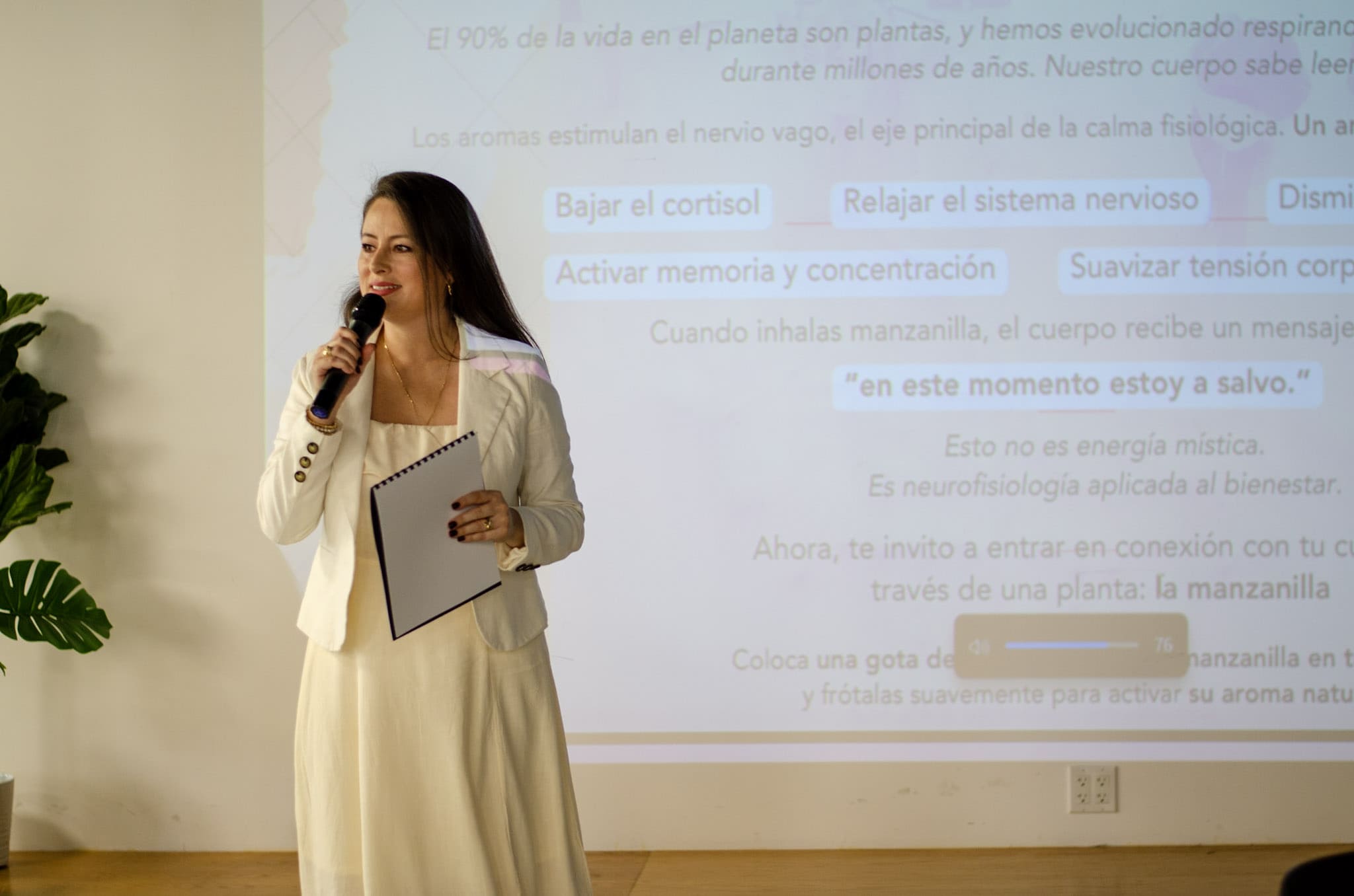 Representación de María Claros Therapy, guiará la experiencia de meditación y respiración consciente junto al aceite esencial de manzanilla, como una invitación a volver al cuerpo y al sistema nervioso desde la biología y la presencia.